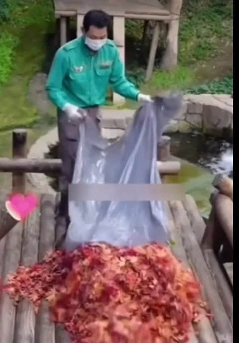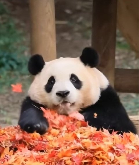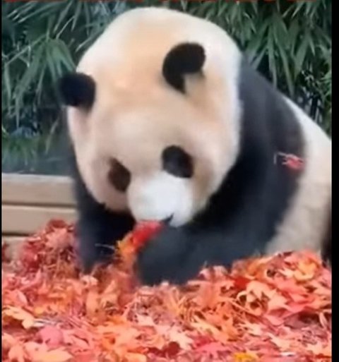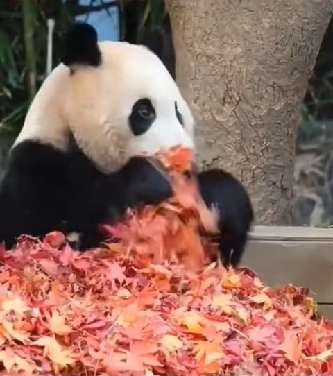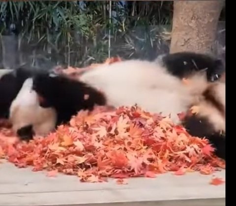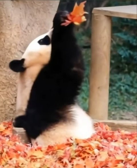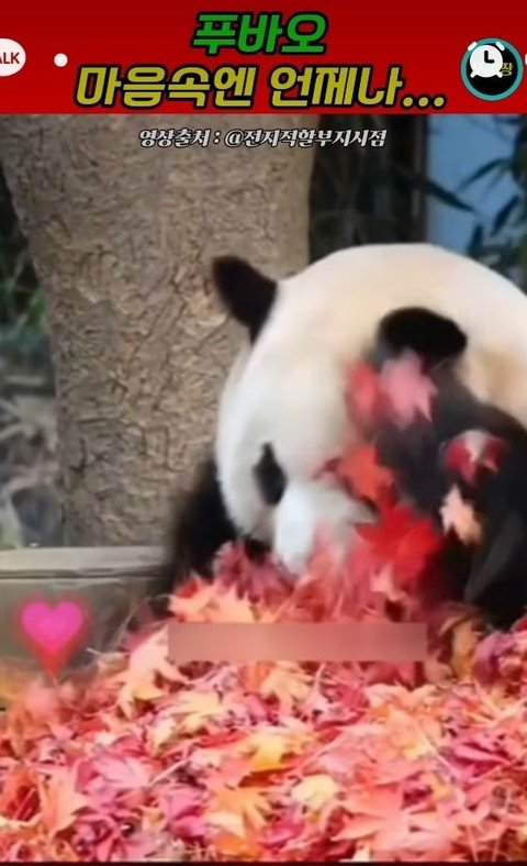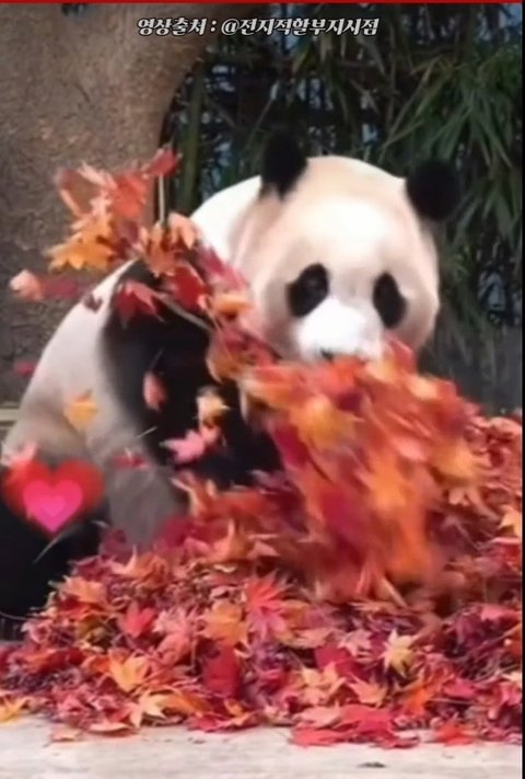 에버에서 송바오님이 단풍든 낙엽을쌓아