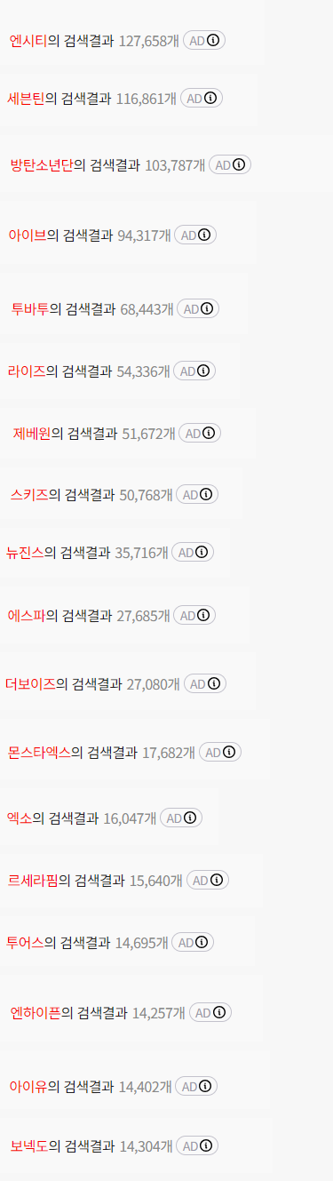 엔시티, 세븐틴, 방탄, 아이브, 투바투, 라이즈, 제베원, 스키즈, 뉴진스, 에스파, 더보이즈,