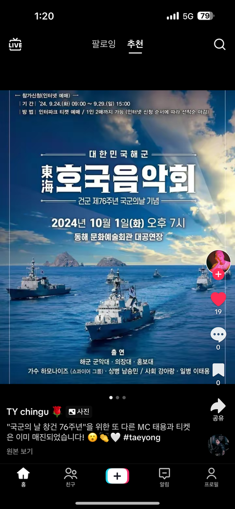 대한민국 해군《호국음악회》건군 제76주년 국군의날 기념으로 엔시티 태용 MC보니까 많은 관심 부탁 티켓 모두 매진 됐음 툥프들 시즈니들