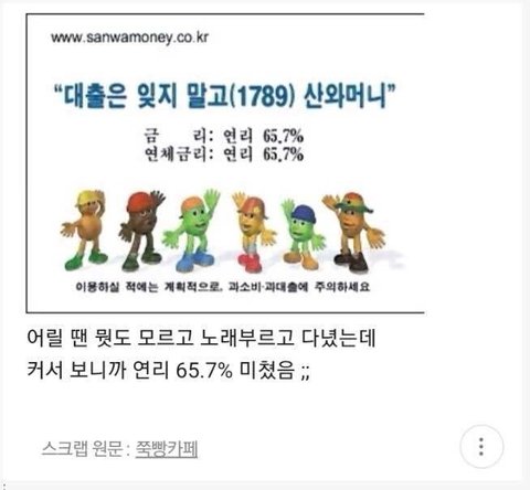 애초에 저 회사 일본 기업인데 우리나라 imf 경제 사회 힘들었던 시기에 일본 조폭? 비슷 무리한 놈들이 그거 노리고 우리나라로 넘어온거임 일본에는 아직 산와머니 있다던데.. 실제로 우리나라에 산와머니 대부업체 도입된 이후에 쟤네 매출 엄청 많이 찍었댔음 순이익이 몇백억이랬나? 저거 초기 당시에는 진짜 ㄹㅇ 받을 때 까지 독촉전화하고 협박 하고 그랬다잖음 저 회사 이자때문에 ㅈㅅ한 사람도 있다는 얘기 있을정도