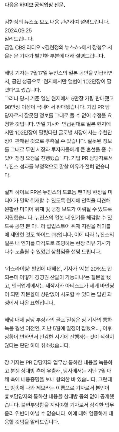 정정보도를 하지 않으면 뉴진스 일본 성적 올려치기로 인해 주가 상승하고 주가 조작혐의로 검찰에 기소되길 바랬던 모 팬덤은 하이브가 정정보도를 요청했다는 기사가 올라오자 속이 아프시기 시작함