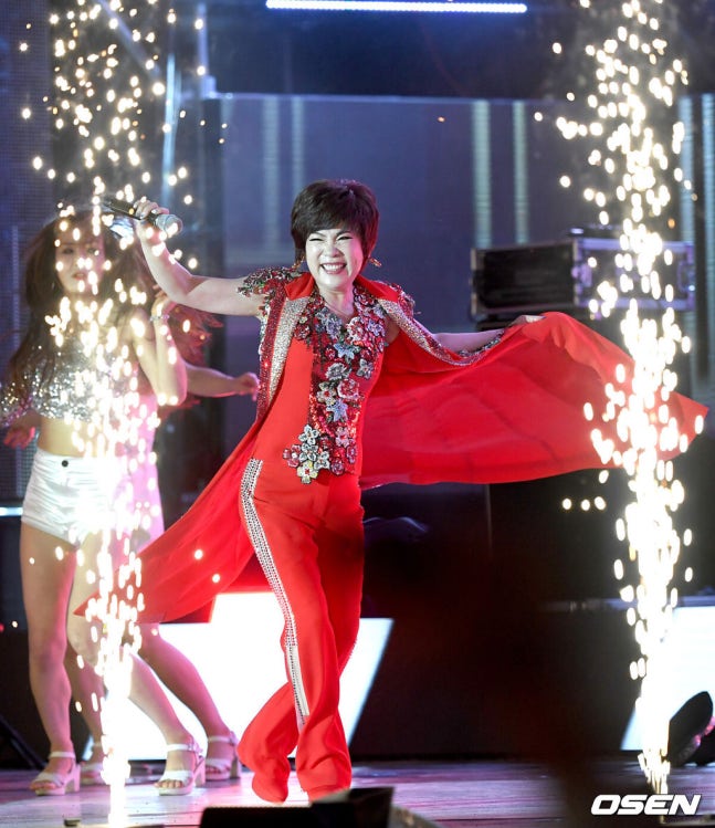 [OSEN=광주, 최규한 기자] 11일 오후 광주 518 민주광장 특설무대에서 ‘2019 광주 세계수영선수권대회’ 전야제 및 축하콘서트가 열렸다.가수 김연자가 무대를 펼치고 있다. /dreamer@osen.co.kr