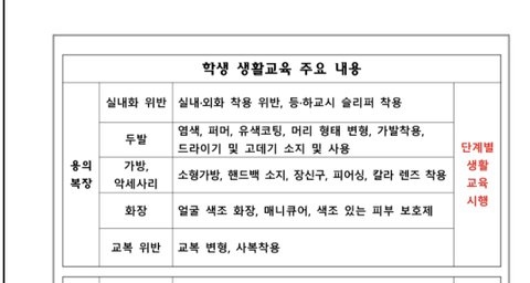 사복같은건 사실 안입는거 당연하긴 한데 다른 교칙들은 좀 심한거 아니냐고 애들 사이에서 난리남.....심한건 아닌가??솔직히 슬리퍼같은것도 못신게 하는건 좀 너무한데 머리 변형도 금지고....근데 문제는 1,2학년만 엄청 잡고 3학년은 제대로 안잡는게 문제임 억울해서 학교 못다닌다ㅠㅋㅋㅋㅎ