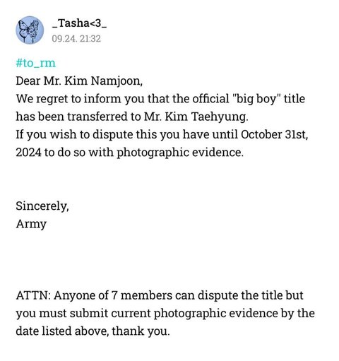 대충 번역: 남준오빠 빅보이 타이틀 태형이한테 넘긴다 반박하고싶음 10월31일까지 증거사진 올려라