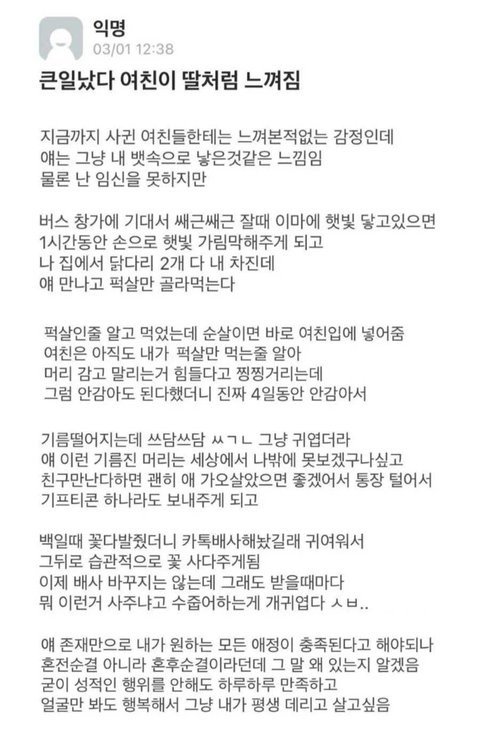 낳을 수 있을거 같아짐..ㅋㅋㅋㅋㅋㅋ이거랑 그 한양대생 여자친구 청각장애있는 글이였나 그런 글 보면(사진은 없어서 찾아봐 ㅈㅅ) ㄹㅇ 결혼을 왜 하는지 조금은 알 거 같음.. 난 솔직히 사귈땐 멀쩡한 척 하다가 결혼해서 남자가 돌변하고 소리지르고 때리면 뭐 이혼하기도 복잡하고 사람 못 믿음+자식도 나 닮은 자식 낳으면 난 절대 케어 못 할거같다고 생각했는데 진짜 저런 사람이랑 결혼하면 나같은 자식이라도 사랑하고 예뻐할 수 있을거 같아서 쌉가능일거 같단 생각을 해봤다