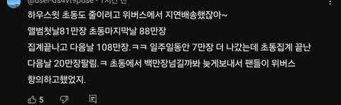 방탄은 솔로 시작할때 초동 집계기간 끝나고 한국 미국 유럽 무려 3단 배송했었음 초동기록 방해하는거냐 농담반 진담반으로 말 나왔었는데 이 정도면 합리적인 의심 아닌가 심지어 중국바에서 초동 주문한 수 십만 장이 배송 전 날 취소된 멤버도 있었음 찐이면 하이브 개양아치네