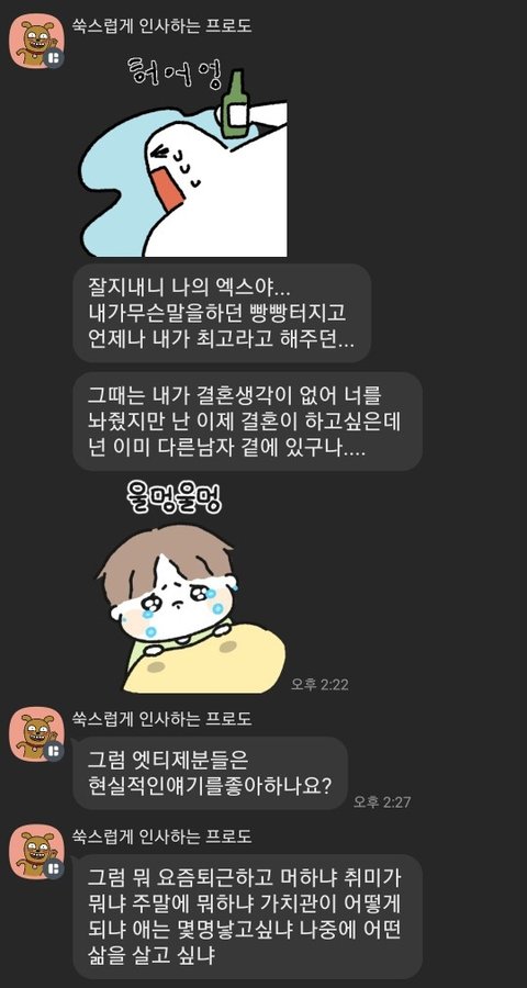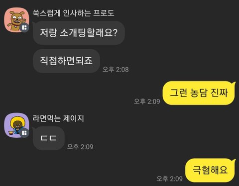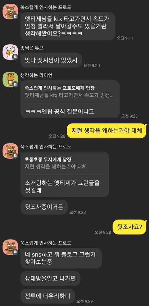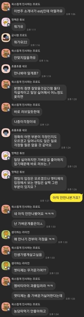 남자(프로도) 공기업 차장이라하고 ENTP라는데 ESTJ 오픈채팅방 들어와서 엣티제에 대해 이것저것 물어보던중에 쎄함을 느낌
