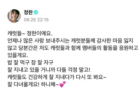 보니까 선복무일 것 같던데 정말 조용히 복무 시작했네 정한이ㅜ