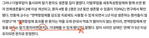 어머니께서는 임핀지가 너무너무 효과적이라!! 6개월만에 암 크기가 반이나 줄고, 대부분 비활동성 일 것 같다는 주치의 선생님의 소견과 극적인 효과를 알리는 인터뷰까지 찍게 되었습니다!! ^____^ 올해들어 젤 기쁜 순간이었습니다