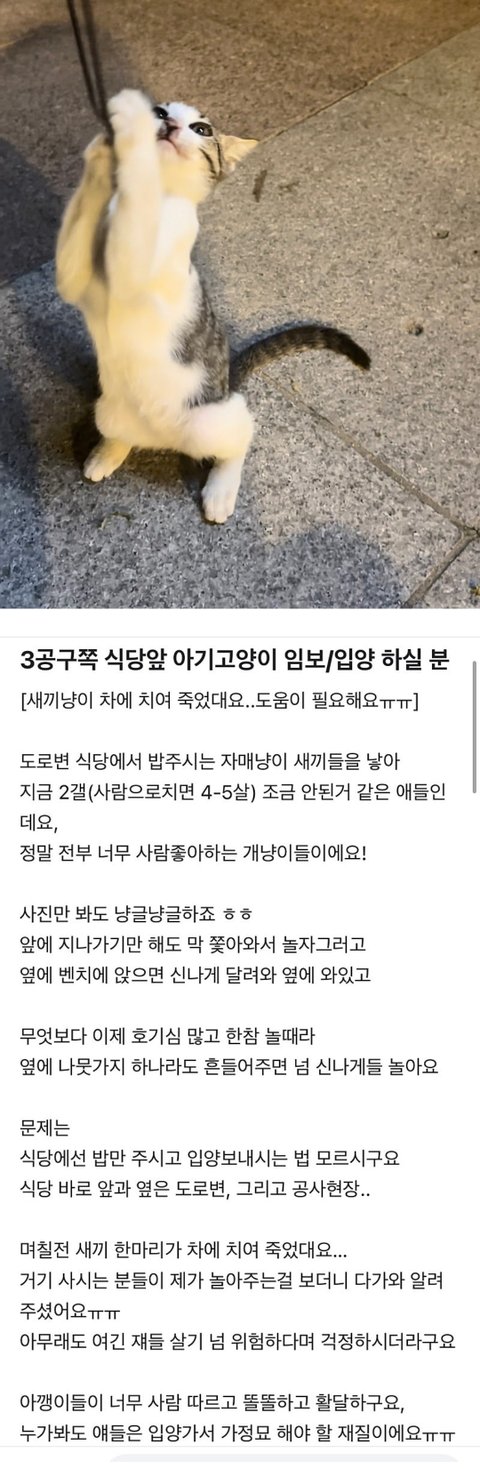 이제 좀 커서 호기심에 막 돌아다니던 아가냥 두마리가 얼마전 차에 치어 죽었다 해요…