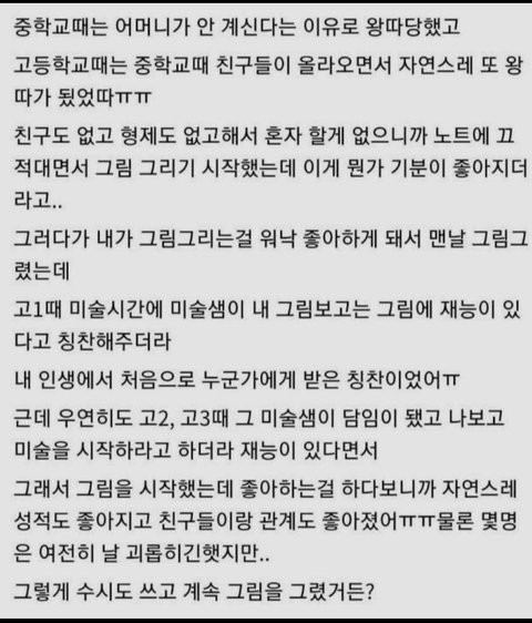 뒷얘기가 1학년때 미술쌤이 알아보고 2,3학년 자기가 담임 자처했다고 하시더라구여ㅠㅠㅠㅠㅠ