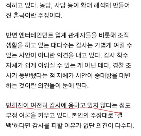 민희진은 법대로 경찰조사 잘만 받았구만 하이브 감사에 응하지 않는다며 호통을 치냐 ㅋㅋㅋㅋㅋㅋㅋㅋㅋ 하이브 감사 받으면 뭐하는데? 어차피 민희진 쫓아내려는 집단이 며칠 내내 괴롭히는거 가만히 들으란 소리 아님? 그걸 지금 상황에 굳이 응해야할 이유는 또 뭐냐 어차피 틀어진 사이에 싸우기나 할거 ㅋㅋ