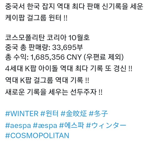 윈터 이번에 폴로 랄프로렌으로 코스모폴리탄 코리아 10월호 커버 화보 찍었는데 발간된지 9일만에 중국에서 한국 잡지 역대 최고 판매량 경신했대 ㄷㄷ 에스파 중국에서 인기 많은건 알았지만 윈터가 이정도로 인기 많은지 몰랐음