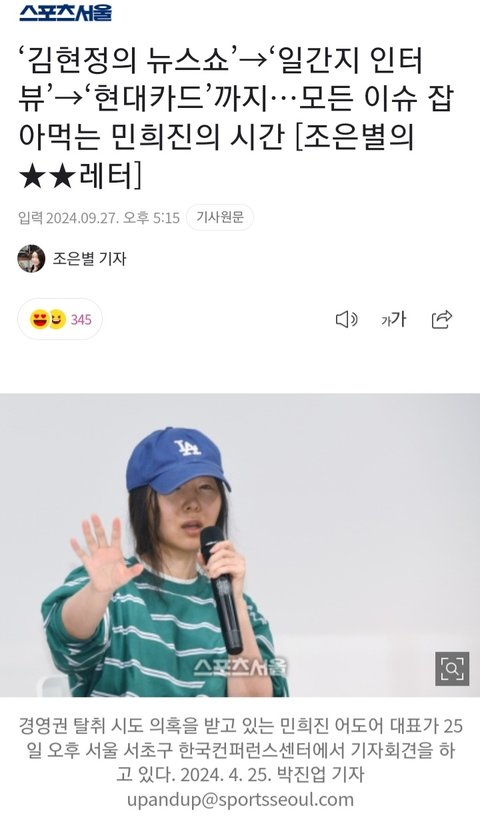 [스포츠서울 | 조은별 기자] 또다시 민희진의 시간이다. 한동안 침묵을 지키던 민희진 어도어 전 대표가 다시금 현란한 화술을 자랑했다.