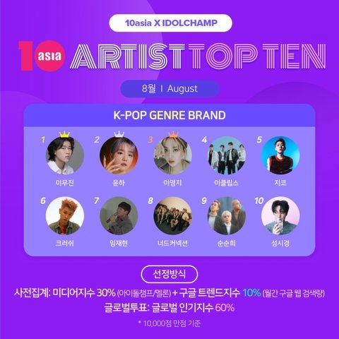 잔나비, 윤하, 이영지, 이클립스, 지코, 크러쉬, 임재현, 너드커넥션, 순순희, 성시경이 텐아시아 아티스트탑텐(TENASIA ARTIST TOP TEN) 8월 'K팝 장르 브랜드(K-POP GENRE BRAND)' 주인공으로 선정됐다.