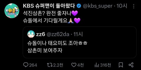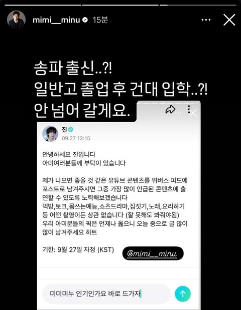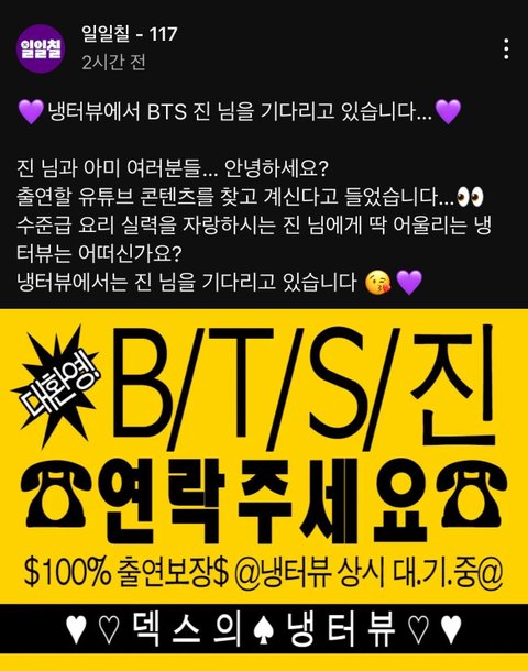 앨범활동할때 나갔으면 좋겠는 예능들 추천 받는다고 하니까 인기인가요,냉터뷰,동네스타k4,슈돌에서 모셔갈려고 러브콜 보내고있음 어떤 예능프로그램이 진을 데리고 갈까ㅋㅋㅋㅋ 음악프로그램도 나와주면 좋겠다