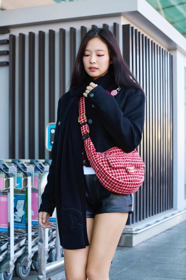 제니는 샤넬의 2024/25 가을-겨울 프리-컬렉션의 울 소재 재킷과 트위드 까멜리아 브로치, 여기에 2024/25 코코네쥬 컬렉션의 울 트위드 호보 백에 스카프를 둘러 패션을 완성했다