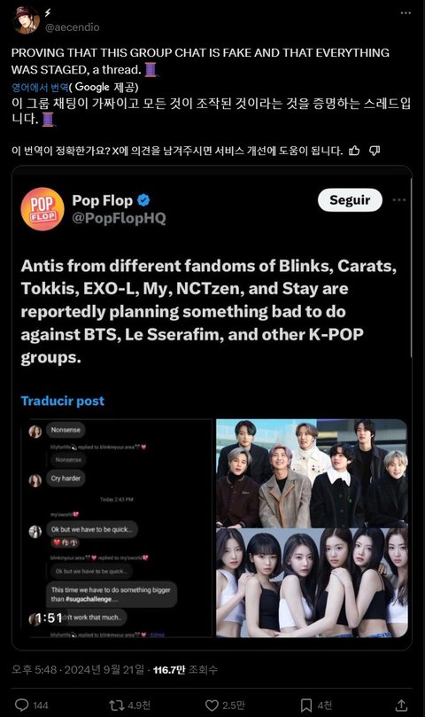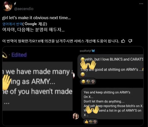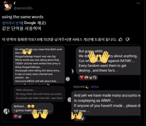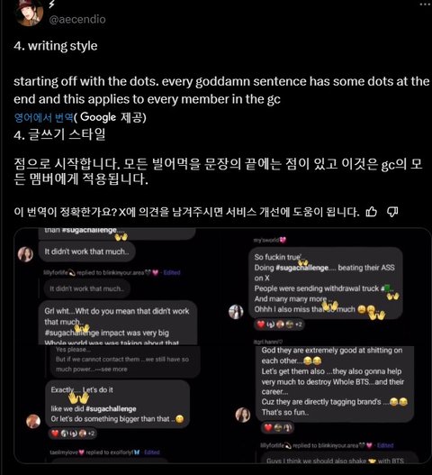 1.이번에는 슈가챌리지보다 큰걸 해야할거같아 .. 그게 효과적이지는 않았던듯2.#슈가챌린지 효과는 컸어 전세계가 그거에 관해 얘기함 아미들 슈가챌린지 언급하는 기사도 만 개 넘게나고 머글들이 아미들 욕함3.민희진이 방탄 아일릿 르세라핌 전부 나락보냈으면 좋겠다.....ᄏᄏᄏᄏᄏ걱정마 이미 그러고 있음4.난 블링크랑 캐럿이 좋아 아미들 패는데 항상 진심이라 ᄏᄏᄏᄏᄏᄏ5.근데 아미인척 팬코하는 계정들도 엄청 많아;;