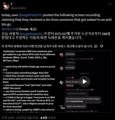 -슈가 챌린지'를 인정하면 그들은 이를 자랑스럽게 생각합니다-이보다 더 큰 계획을 세우고 싶다-트럭과 화환을 보내준 한국 개인팬들과 안티들에게 연락해 도움을 줘야한다-태일에게 매우 분노함-모든 팬덤과 K-미디어가 방탄소년단에 반대하기 때문에 무언가를 계획하는 것이 쉬울 거라고 말한다-그룹 채팅의 한 토끼는 "모두가 민희진과 뉴진의 편"이라며 기뻐하며 "방탄소년단, 르세라핌, 아일릿을 파괴하고 몰락을 기도해 달라고 부탁할 수 있기를 희망한다-슈가챌린지가 아미들이 한 게 아니라는 걸 증명하는 아미들에게 붙잡혔다는 걸 인정함-SNS 에 계정 만들어서 아미 코스프레를 하고 다른 아이돌을 끌어들여 팬덤싸움을 시작한 사실을 인정합니다아미들 계속해서 위와 같은 트윗을 리트윗하고 팬덤에 욕설을 퍼부으며 방탄소년단을 더 지지하겠다고 약속했음아래부터는 그 중 일부 트윗 가져옴