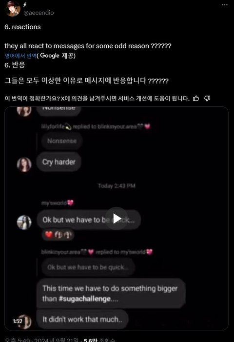 그리고 다른 팬들도 채팅에서 이런걸 발견함-이름 검색했을 때 7개의 계정 중 단 하나도 존재하지 않음.....-7개 계정 이름 모두 해당 그룹, 멤버, 팬덤명으로 만들어져서 더 그럴듯해보임 예).....blinkinyour.are, exolforlyf, lillyforlife, taeilmylove, itgirl.hanni, mingu's bitch*, my'sworld-7개 계정 모두 서로 메시지를 승인하기 위해 'yeah' 대신 'yeh'라는 단어를 사용....-7개 계정 모두 불필요하게 """"를 사용함 "너무 사실처럼" , "My’s".....-7개 계정 모두 불필요하게 "..."을 너무 많이 사용했습니다.....-메시지의 동영상은 삭제되었지만 이걸 노출한 사용자는 동영상에서 응답 소리가 난다고 언급하기도 했음.....