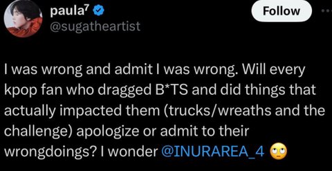 이 사실이 밝혀진 후 슈가팬 아미들에게 최초로 먼저 DM 보낸 사람 계폭함 ......슈가팬 아미들이 부정적인 반응을 너무 많이 받은 후에 , 계정주가 본인 트윗을 삭제하고 자신이 틀렸다고 인정했지만 너무 뻔뻔해서 여전히 "챌린지를 하고 화환이랑 트럭 을 보낸 다른 팬덤은 사과하고 잘못을 인정해야 한다"고 주장하고 있음