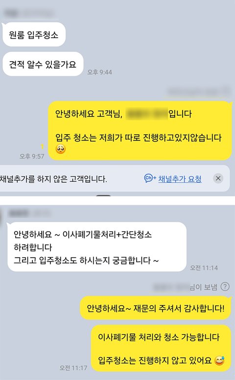 위의 다른 분들의 상담내용과 같이 입주청소 의뢰는 들어오더라도 거절을 하고 있습니다.