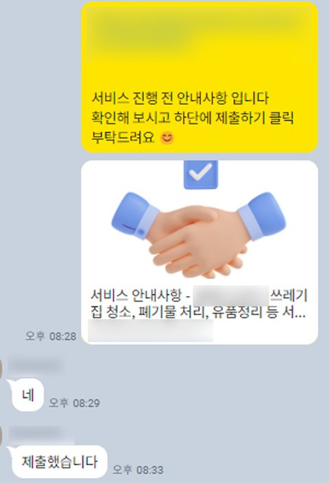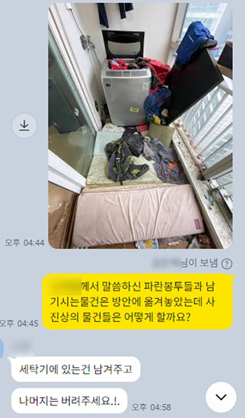 작업 전 대화에서도 이사짐을 거의 다 싸둔 상태라고까지 말씀하셨고 저희 또한 청소에 필요한 최소한의 폐기물만 수거하였습니다.