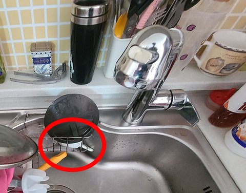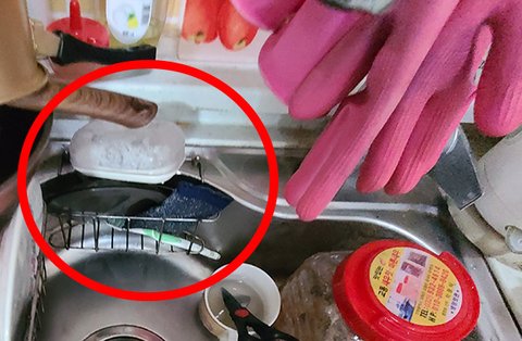 저희업체에 보상을 요구했던 추억이 깃든 비누케이스는 싱크대 커버에 가려 자세히 보이진 않지만 칫솔 손잡이 부분과 비누케이스 바닥면이 일치하며, 다른 물품과 혼동이 될 만큼 다른 물품이 섞일 우려가 전혀 없어 보입니다.