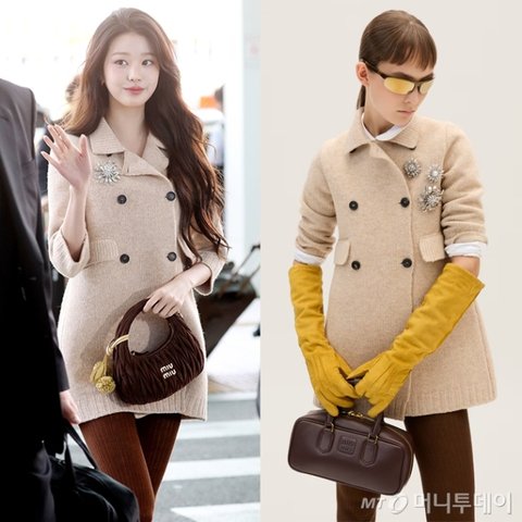 /사진=미우 미우장원영이 착용한 의상은 모두 '미우 미우' 제품이다. 재킷은 655만원, 타이즈는 117만원 등으로 이날 착용한 아이템의 가격을 합하면 1500만원에 달한다.미우 미우 모델은 니트 코트 안에 흰색 셔츠를 받쳐 입고 양손에 머스터드 색상의 가죽 글러브를 착용했다. 장원영과 같은 타이즈를 매치한 모델은 검은색 T 스트랩 슈즈와 버건디 색상의 미니 토트백을 매치해 개성 있는 가을 룩을 제안했다.