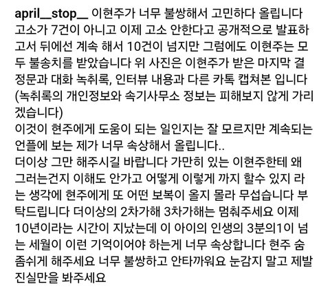 최근에 올라온 에이프릴 스탭 쉴드글도 어찌보면 걔네랑 친한 지인이었을텐데 5명을 지혼자서 왕따를 시켰니마니 ㅋㅋㅋ 웃기지도 않음 갑질 논란 터졌던 그분도 자기 사람이라고 생각되는 스텝한테는 잘해줘서 미담 올라왔었음ㅋㅋ 애초에 고소 7번 한거부터 심리적으로 ㅈㄴ 힘들게 만들었구만