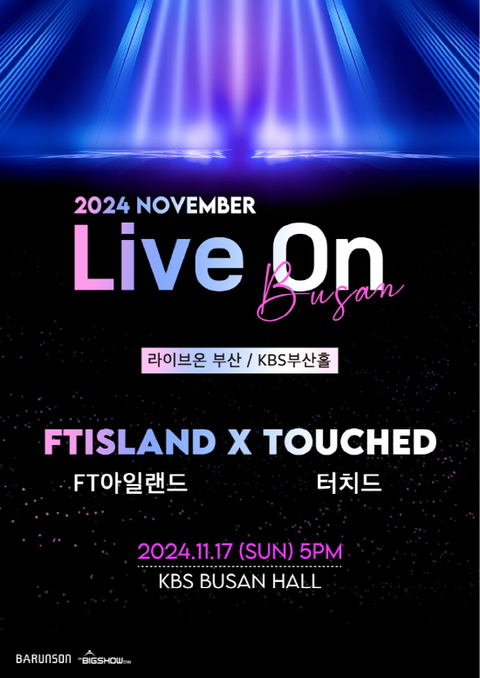 바른손이 주최하고 빅쇼이엔엠이 주관하는 ‘LIVE ON 부산 FT아일랜드(FTISLAND) X 터치드(TOUCHED)’ 옴니버스 공연이 오는 11월 17일 오후 5시 KBS부산홀에서 개최된다.