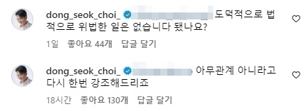 최동석 소셜미디어그는 2일에도 "도덕적으로 법적으로 위법한 일은 없습니다. 됐나요?", "아무 관계 아니라고 다시 한 번 강조해드리죠"라고 강조했다.