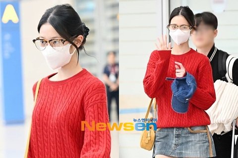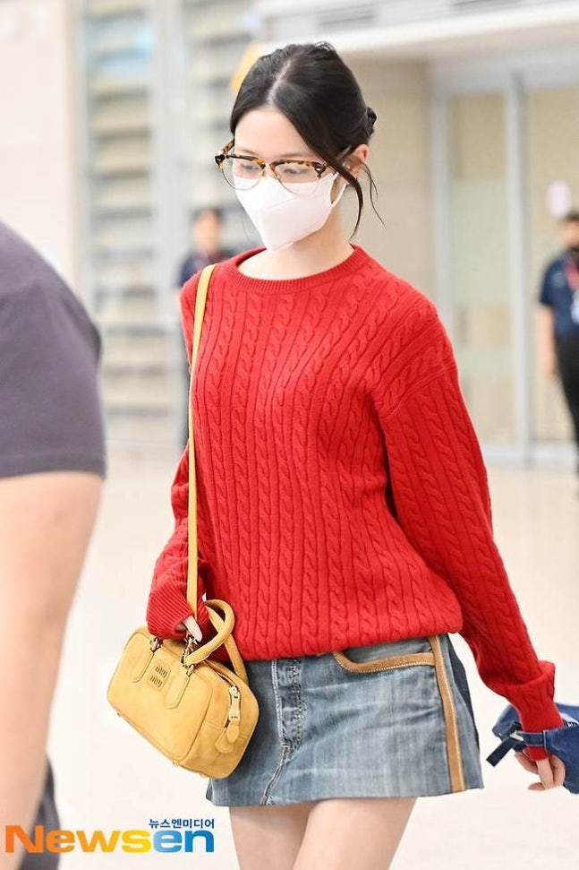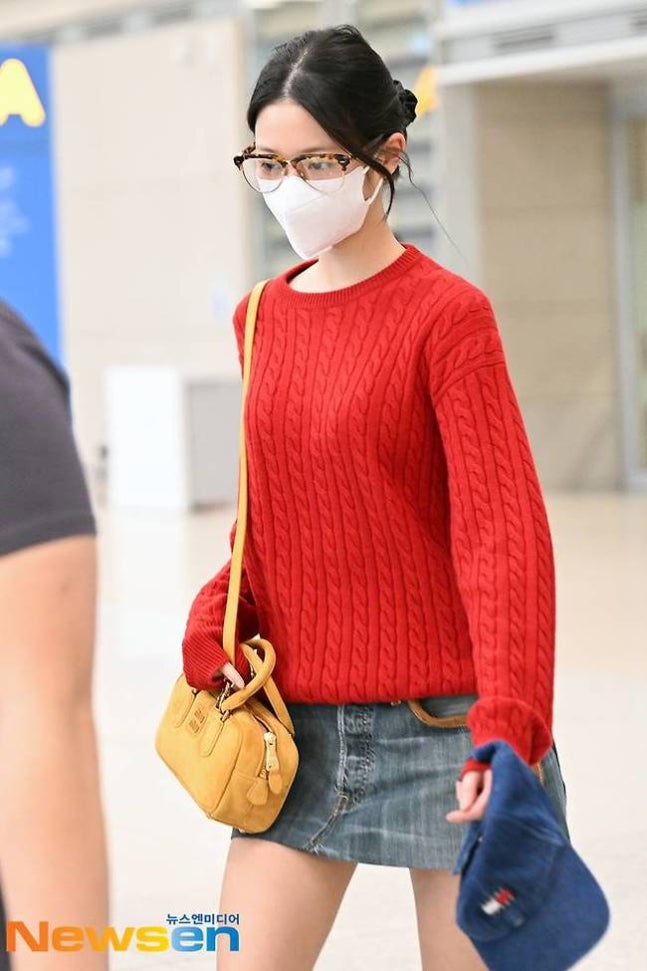 이날 장원영은 강렬한 레드 니트에 청치마 코디로 가을 무드를 완벽하게 보여줬다. 여기에 장원영은 호피무늬 안경으로 유니크함을 더했다.