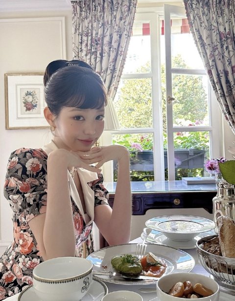 사진 속 장원영은 근사하게 음식이 차려진 식탁 앞에서 포즈를 취하고 있는 모습. 꽃 문양 원피스를 입고 앞머리를 낸 올림 머리 스타일이 마치 오드리 헵번을 연상하게 한다. 특히 찻잔보다 작은 얼굴이 시선을 끈다.