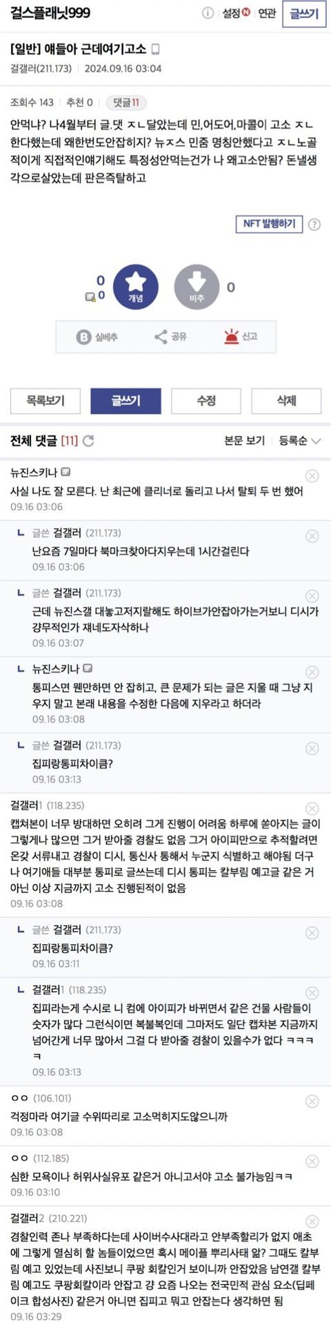 양쪽 다 몰려와서 __내는거 ㅈ같다는건데 늊팬탓은 무슨ㅋㅋ 걍 걸플갤이던 늊갤이던 갤저씨 갤줌들 다 꺼지라고