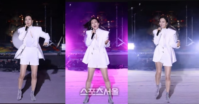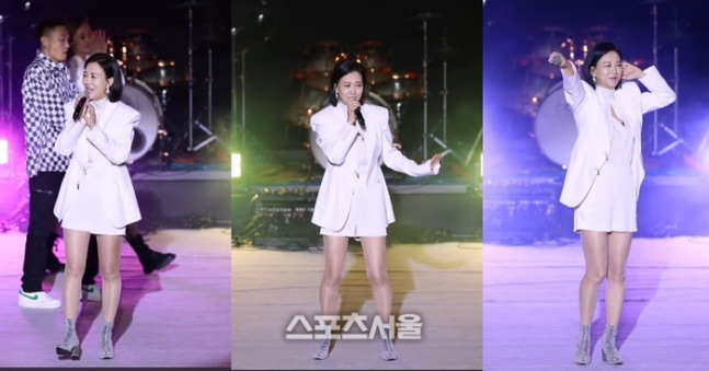 장윤정은 흰색 재킷과 블라우스, 3부 팬츠로 톤을 맞춘 의상과 회색 앵글 부츠를 신고 무대에 올랐다. 저녁 기온은 10℃ 안팎의 쌀쌀한 날씨였다. 장윤정은 “여자 가수 저 혼자 반바지 입고 왔더니 추워죽겠다. 여러분 춥지 않냐”며 “여러분 박수 소리와 함성에 제 마음이 뜨거워진다”고 호응을 유도했다.