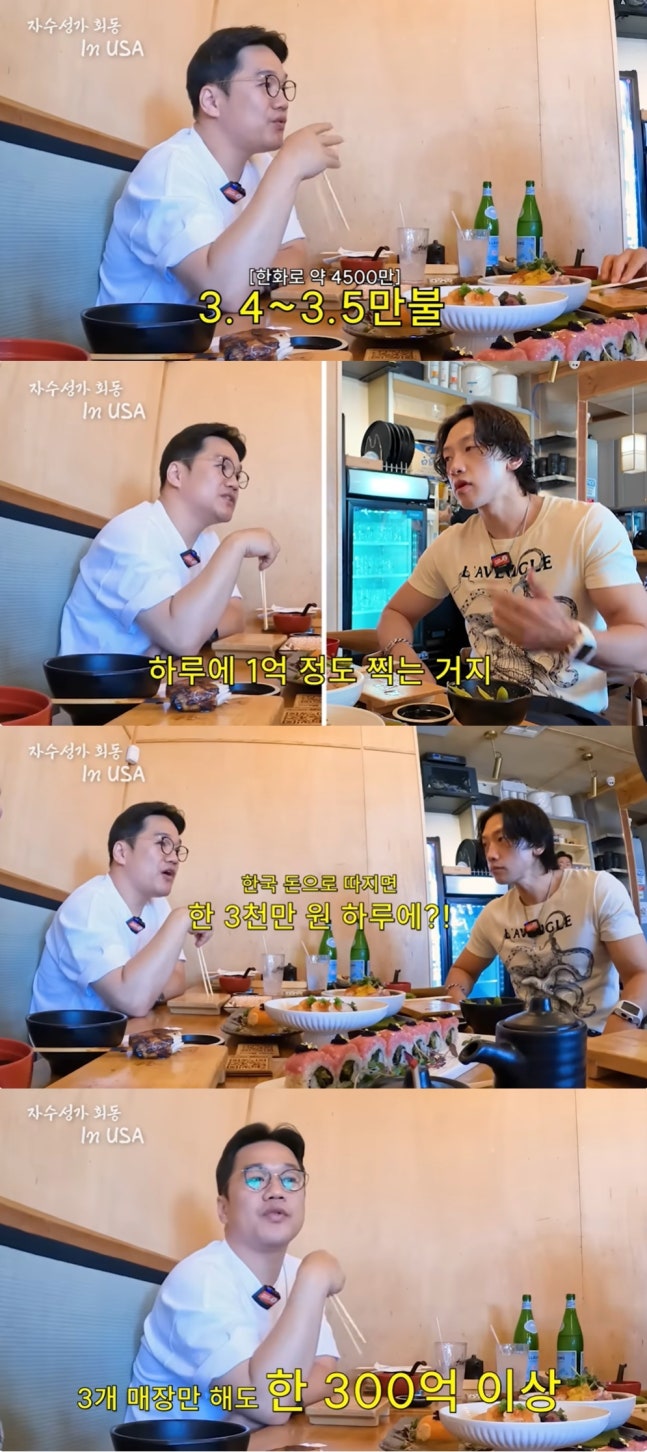 동창은 매출에 대해 "어제 하루 매출이 한국 돈으로 따지면 3000만 원이다"라며 "어바인 지점은 4500만 원이다. 두 곳이랑 세 번째까지 합치면 하루에 1억 원 찍는 거다. 순수 매상만"이라고 밝혀 놀라움을 자아냈다.