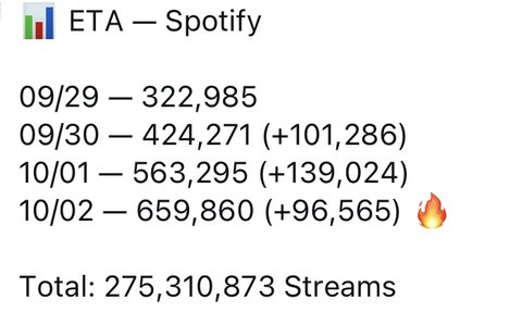 어떤 미국에서 유명한 스트리머가 트위치 10만 팔로우 돼서 eta 틀었는데 그 때 기점으로다가 미국 스포티파이 거의 2배로 증가하였고 현재 애플뮤직 kpop 부문에서 지민 who 다음으로 2등이래