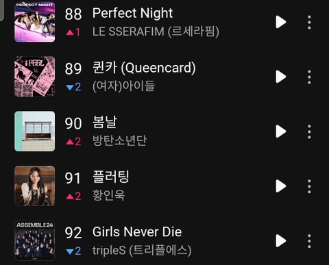 ㅇㅇ 80,90에 보통 있다가 아미들 개빡쳐서 스밍하면 6,70에 오르고 그래ㅇㅇ 아미판이 예전처럼 스밍하는 분위기가 아니라 8,90위 인거지 지금 멜론 떠난 아미들도 많고, 이제 연차 많이 찬만큼 팬들도 연차차서 예전처럼 숨쉬듯 스밍하는 아미 많이 줄었는데도 봄날은 늘 리스트에 있음... 대중픽도 많고...