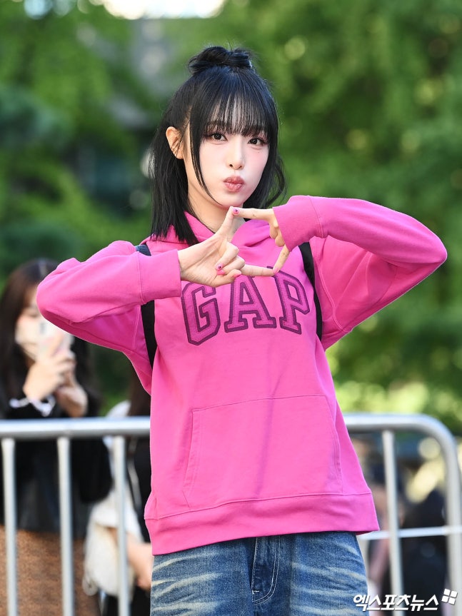 가수 최예나가 출근길에 포즈를 취하고 있다.