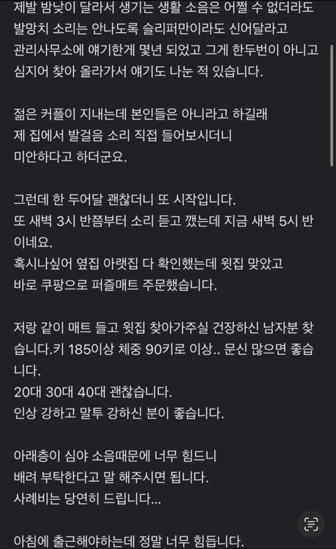 이거 ㄹㅇ임 이사오고 윗집은 새벽1시까지뛰고 아랫집은 새벽까지 노래쳐부르며 놀았는데 온몸문신인 아는동생불러서 이사왔다고 인사돌리니까 조용해짐 지금 1년넘게편안함