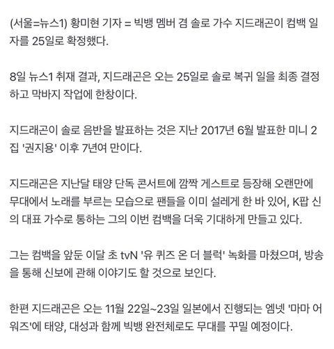 새로운 지디 음악을 들을 수 있다는게 행복하고 고마움ㅠㅠ 25일 딱대