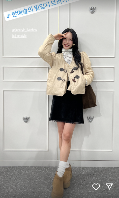 한예슬은 8일 자신의 인스타그램 스토리에 사진 한 장을 올리며 ‘한예슬의 뭐 입지 보러가기’를 홍보했다. CJ온스타일 '한예슬의 오늘 뭐 입지?’는 '큐레이션'이 강화된 새로운 모바일 라이브쇼다.
