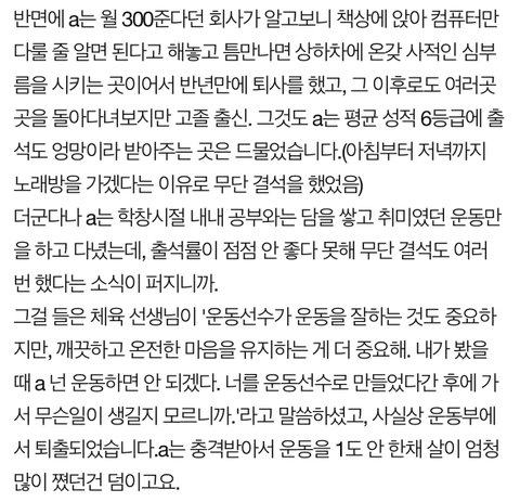 그걸 들은 체육 선생님이 '운동선수가 운동을 잘하는 것도 중요하지만, 깨끗하고 온전한 마음을 유지하는 게 더 중요해. 내가 봤을 때 a 넌 운동하면 안 되겠다. 너를 운동선수로 만들었다간 후에 가서 무슨일이 생길지 모르니까.'라고 말씀하셨고, 사실상 운동부에서 퇴출되었습니다.a는 충격받아서 운동을 1도 안 한채 살이 엄청 많이 쪘던건 덤이고요.