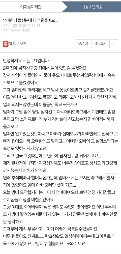 엥 ㅋㅋ 부모보다 애가 더 문젠데 고1이 남자친구랑 그짓하다가 걸린건데 이걸 그냥 넘어간다고?