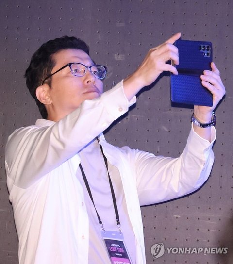 (서울=연합뉴스) 이재희 기자 = 걸그룹 피프티피프티의 두 번째 미니앨범 '러브 튠'(LOVE TUNE) 발표회가 열린 20일 오후 서울 광진구 예스24라이브홀에서 소속사인 어트랙트의 전홍준 대표가 신곡 무대를 휴대전화로 촬영하고 있다.