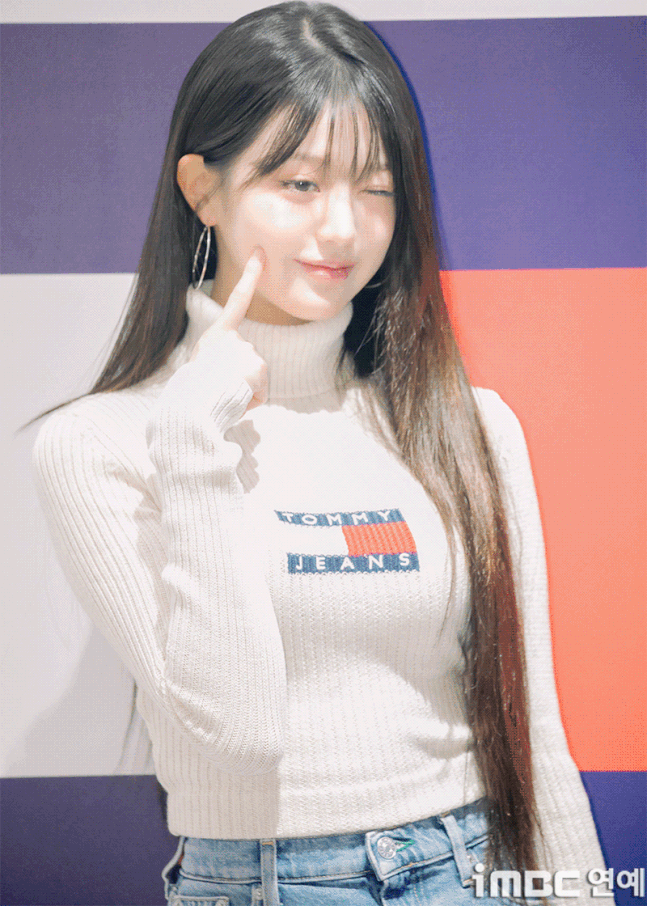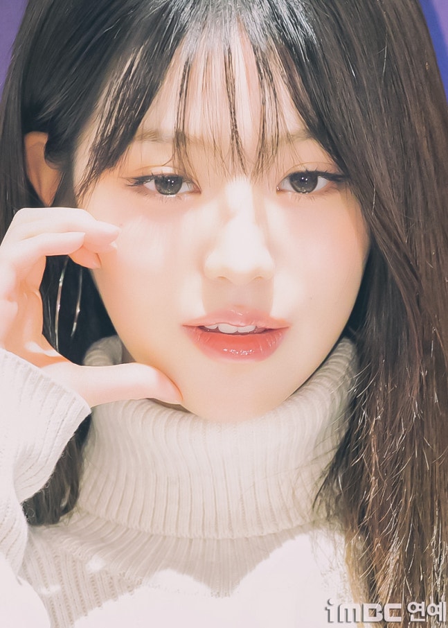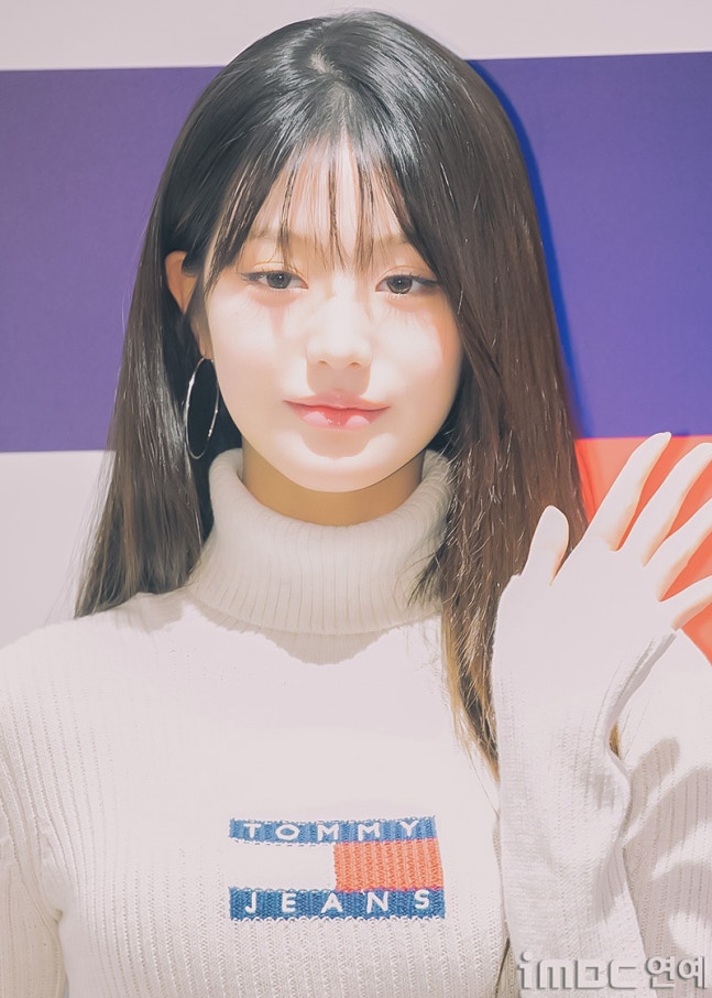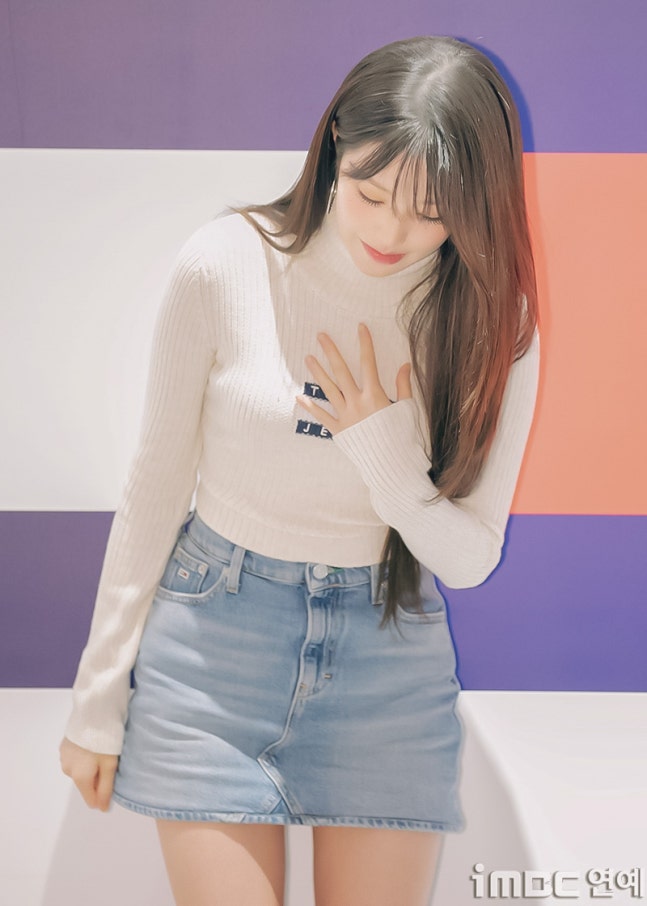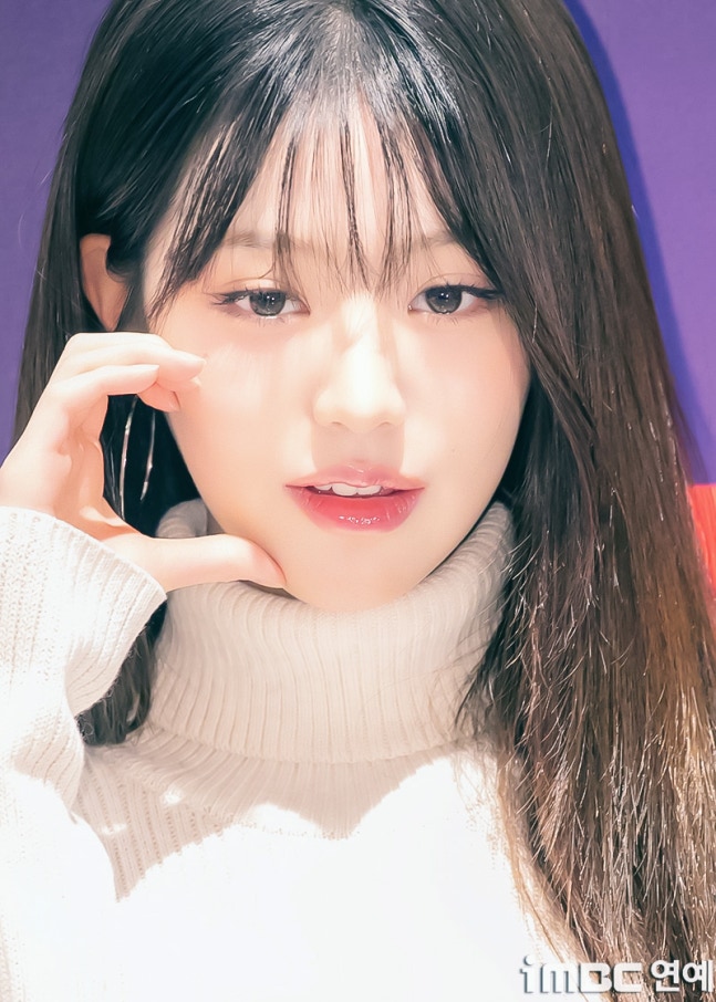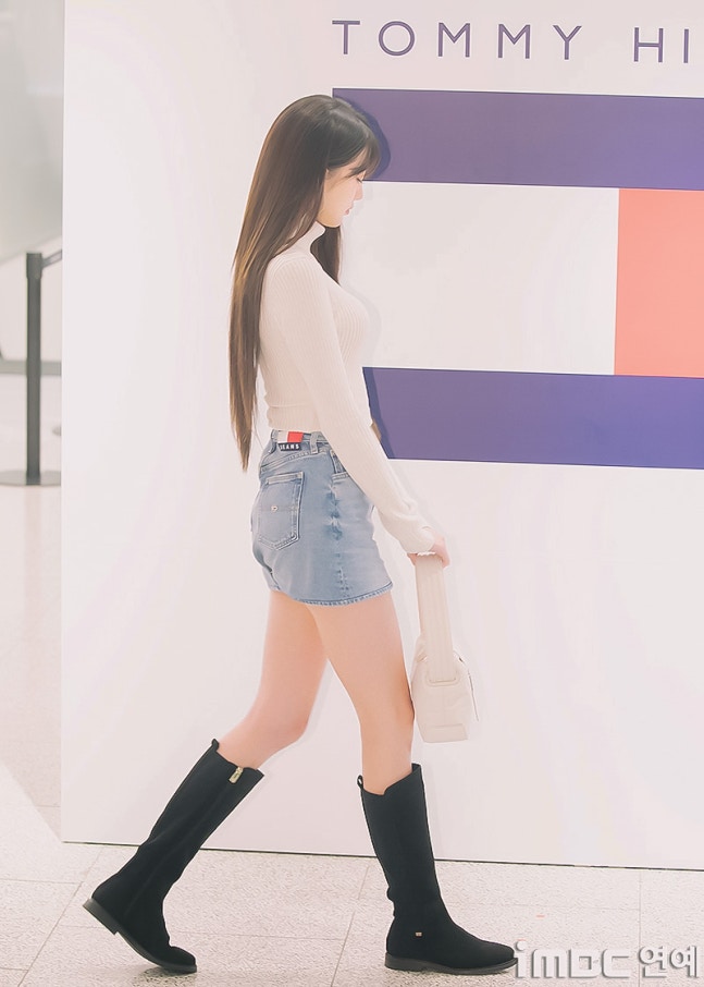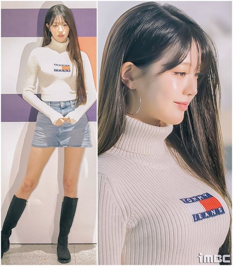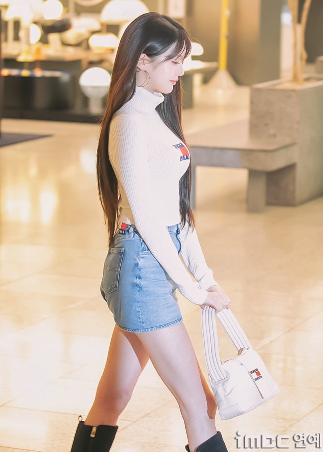 이날 장원영은 긴 생머리에 베이지 화이트 목 폴라 니트 및 청 스커트. 블랙 롱부츠로 아름다운 각선미를 뽐내며 등장. 좌중을 압도 하는 여신 미모를 과시했다. 여기에 블링 링 귀걸이와 미니 백이 포인트.