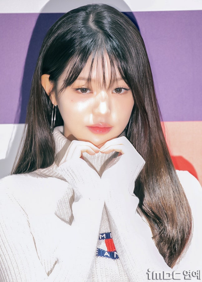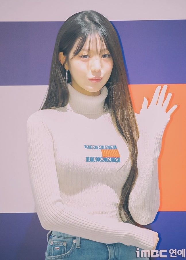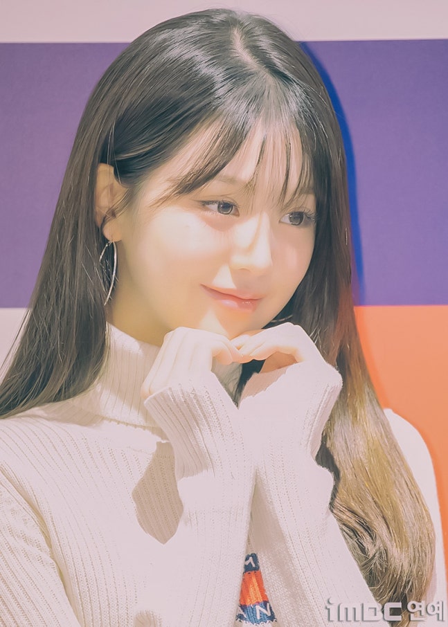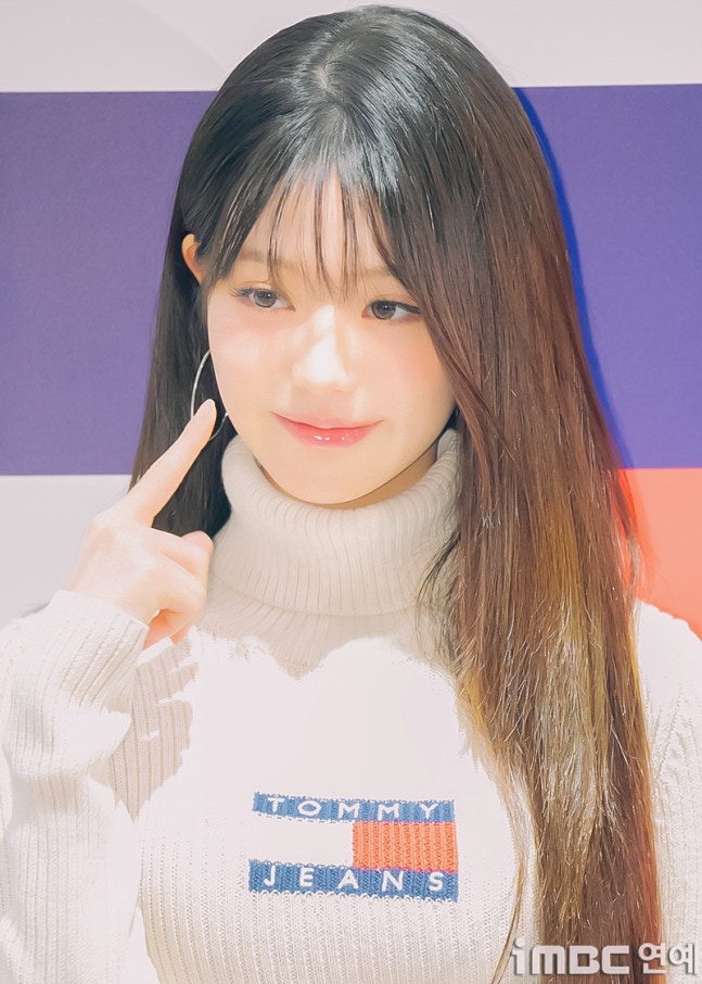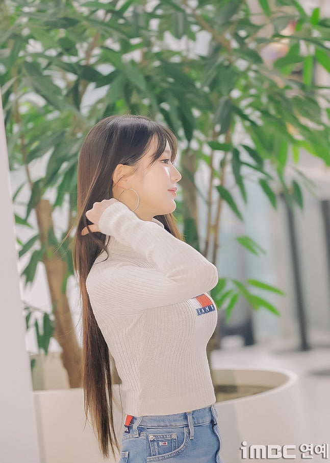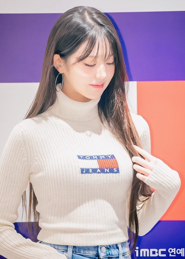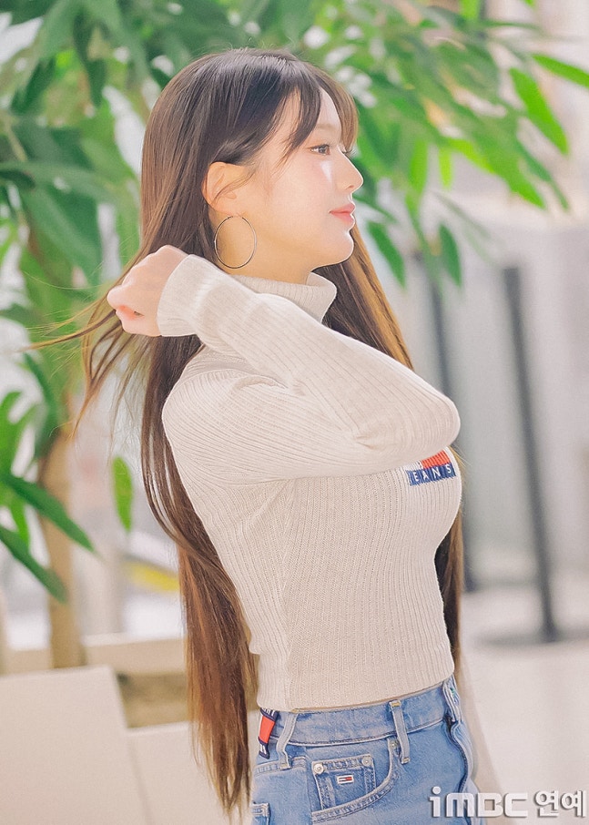 이날 장원영은 긴 생머리에 베이지 화이트 목 폴라 니트 및 청 스커트. 블랙 롱부츠로 아름다운 각선미를 뽐내며 등장. 좌중을 압도 하는 여신 미모를 과시했다. 여기에 블링 링 귀걸이와 미니 백이 포인트.