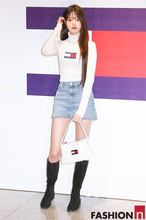 이날 장원영은 늘씬한 각선미가 드러난 미니 데님 스커트에 화이트 니트 터틀넥을 착용한 대학생 여친룩으로 상큼하면서도 러블리한 인형 미모를 뽐냈다.