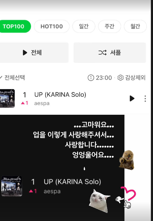 (엑스포츠뉴스 이예진 기자) 그룹 에스파 카리나가 자신이 단독 작사한 솔로곡 'UP'이 차트 1위에 오르자 감격을 표했다.